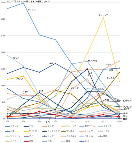 久しぶりに、新型コロナウイルス感染症についての各国の状況です。 人口100万人あたりの死亡者数で比較するのはこれまでと同じですが、 ・4週間ごとの変動(4月8日~10月21日) ・対象国を思いきりしぼって、G7+BRICS+東アジアから南アジアにかけての…