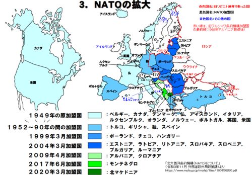 ウクライナをめぐる事態が大変な問題になっていますが・・・ 「北大西洋条約機構(NATO)について」(令和3年11月 外務省欧州局政策課)よりhttps://www.mofa.go.jp/mofaj/files/100156880.pdf 国土に色が塗ってあって国名が黒色文字の国がNATO(…
